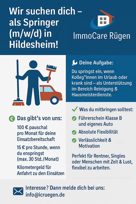 Die ImmoCare Rügen e.K. sucht ab dem 01.05.2025 für den Standort Hildesheim eine engagierte und flexible Persönlichkeit, die unser Team als Springer (m/w/d) bei Krankheit, Urlaub oder anderen Ausfällen unterstützt.